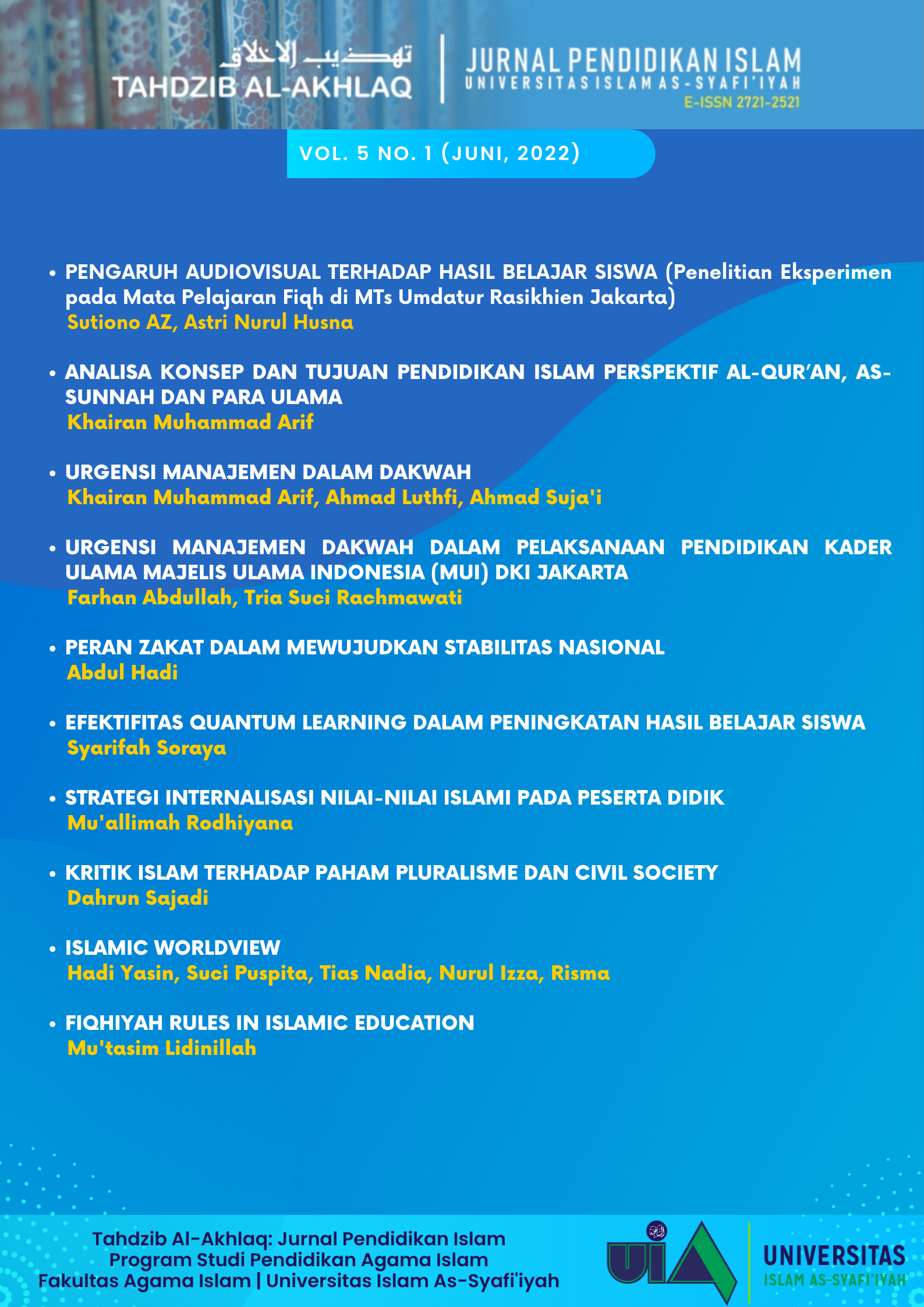 Vol. 5 No. 1 (2022)Alhamdulillah, puji syukur kehadirat Allah SWT karena hanya dengan pertolongan-Nya rencana penerbitan Jurnal Tahdzib Al-Akhlaq: Jurnal Pendidikan Islam dapat terlaksana. Pada edisi Volume 5 No. 1 (2022) ini dimuat 10 (sepuluh) artikel ilmiah yaitu: PENGARUH AUDIO VISUAL TERHADAP HASIL BELAJAR SISWA(Penelitian Eksperimen pada Mata Pelajaran Fiqh di MTs Umdatur Rasikhien Jakarta) oleh Sutiono dan Astri Nurul Husna, ANALISA KONSEP DAN TUJUAN PENDIDIKAN ISLAM PERSPEKTIF AL-QUR’AN, AS-SUNNAH DAN PARA ULAMA oleh Khairan Muhammad Arif, URGENSI MANAJEMEN DALAM DAKWAH oleh Khairan Muhammad Arif, Ahmad Luthfi Choirullah, dan Ahmad Suja’i, URGENSI MANAJEMEN DAKWAH DALAM PELAKSANAAN PENDIDIKAN KADER ULAMA MAJELIS ULAMA INDONESIA (MUI) DKI JAKARTA oleh Farhat Abdullah dan Tria Suci Rachmawati,PERAN ZAKAT DALAM MEWUJUDKAN STABILITAS NASIONAL oleh Abdul Hadi, EFEKTIFITAS QUANTUM LEARNING DALAM PENINGKATAN HASIL BELAJAR SISWA oleh Syarifah Soraya, STRATEGI INTERNALISASI NILAI-NILAI ISLAMI PADA PESERTA DIDIK oleh Mu’allimah Rodhiyana, KRITIK ISLAM TERHADAP PAHAM PLURALISME DAN CIVIL SOCIETY oleh Dahrun Sajadi,ISLAMIC WORLDVIEW oleh Hadi Yasin, Suci Puspita, Tias Nadia, Nurul Izza, dan Risma, FIQHIYAH RULES IN ISLAMIC EDUCATION oleh Mu’tasim Lidinillah. Terima kasih. Semoga Bermanfaat.