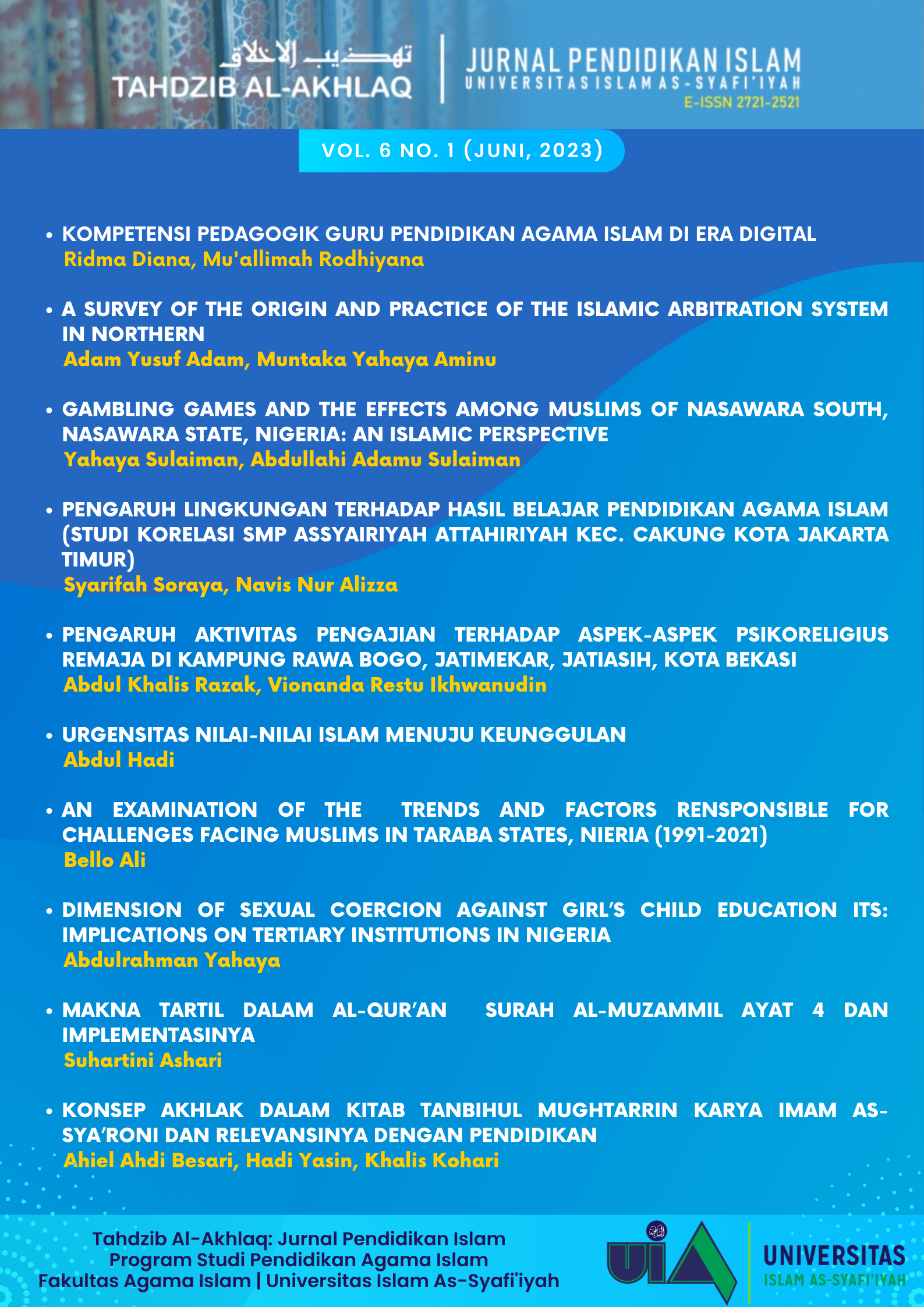 Vol. 6 No. 1 (2023)Alhamdulillah, puji syukur kehadirat Allah SWT karena hanya dengan pertolongan-Nya rencana penerbitan Jurnal Tahdzib Al-Akhlaq: Jurnal Pendidikan Islam dapat terlaksana. Pada edisi Volume 6 No. 1 (2023) ini dimuat 11 (sebelas) artikel ilmiah yaitu: KOMPETENSI PEDAGOGIK GURU PENDIDIKAN AGAMA ISLAM DI ERA DIGITAL oleh Ridma Diana, Mu'allimah Rodhiyana, A SURVEY OF THE ORIGIN AND PRACTICE OF THE ISLAMIC ARBITRATION SYSTEM IN NORTHERN NIGERIA oleh Adam Yusuf Adam, Muntaka Yahaya Aminu, GAMBLING GAMES AND THE EFFECTS AMONG MUSLIMS OF NASAWARA SOUTH, NASAWARA STATE, NIGERIA: AN ISLAMIC PERSPECTIVE oleh Yahaya Sulaiman, Abdullahi Adamu Sulaiman, PENGARUH LINGKUNGAN TERHADAP HASIL BELAJAR PENDIDIKAN AGAMA ISLAMSTUDI KORELASI SMP ASSYAIRIYAH ATTAHIRIYAH KEC. CAKUNG KOTA JAKARTA TIMUR oleh Syarifah Soraya, Navis Nur Alizza, PENGARUH AKTIVITAS PENGAJIAN TERHADAP ASPEK-ASPEK PSIKORELIGIUS REMAJA DI KAMPUNG RAWA BOGO, JATIMEKAR, JATIASIH, KOTA BEKASI oleh Abdul Khalis Razak, Vionanda Restu Ikhwanudin, URGENSITAS NILAI-NILAI ISLAM MENUJU KEUNGGULAN oleh Abdul hadi, AN EXAMINATION OF THE TRENDS AND FACTORS RESPONSIBLE FOR CHALLENGES FACING MUSLIMS IN TARABA STATES, NIERIA (1991-2021) oleh Bello Ali, DIMENSION OF SEXUAL COERCION AGAINST GIRL’S CHILD EDUCATION: ITS IMPLICATIONS ON TERTIARY INSTITUTIONS IN NIGERIA oleh Abdulrahman Yahaya, MAKNA TARTIL DALAM AL-QUR’AN SURAH AL- MUZAMMIL AYAT 4 DAN IMPLEMENTASINYA oleh Suhartini Ashari, dan KONSEP AKHLAK DALAM KITAB TANBIHUL MUGHTARRIN KARYA IMAM AS-SYA’RONI DAN RELEVANSINYA DENGAN PENDIDIKAN oleh Ahiel Ahdi Besari, Hadi Yasin, Khalis Kohari. ANALISA HADIST TAJDID DIN STUDI KOMPARASI KAUM KONSERVATIF DAN MODERNIS oleh Muhibuddin Muhibuddin, Awwab Saefullah. Terima kasih. Semoga Bermanfaat.