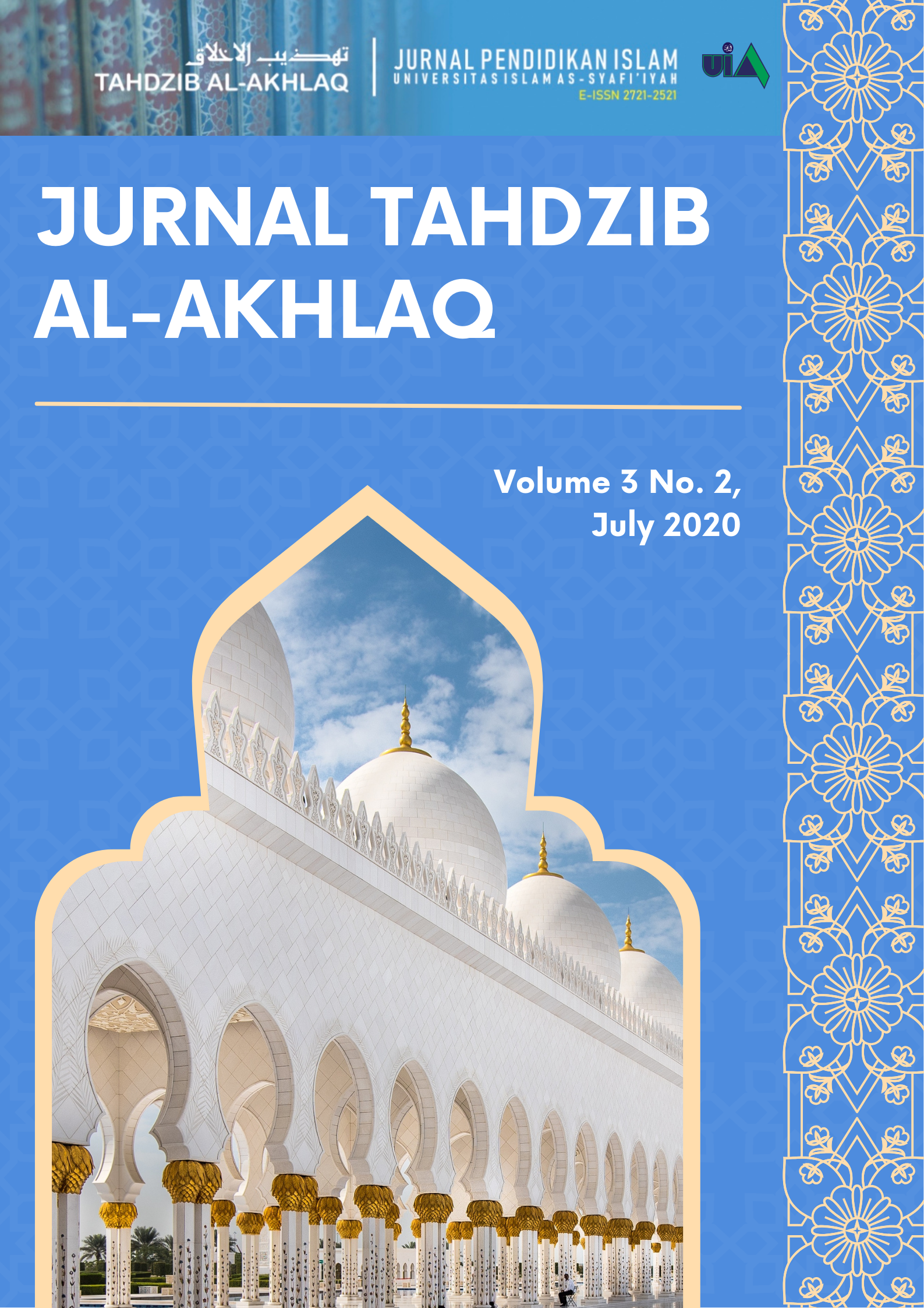 Vol. 7 No. 2 (2024)Alhamdulillah, all praise be to Allah SWT, because only with his help can the plan to publish the Journal of Tahdzib Al-Akhlaq: Journal of Islamic Education be realized. In this edition of Volume 7, No. 2 (2024), 11 (eleven) articles are published, among others, as follows: CHARACTER EDUCATION THROUGH INTEGRATION OF LOCAL AND GLOBAL VALUES by Attabik Luthfi, LOCAL WISDOM OF MUJAHADAH PRAYER AND ITS INFLUENCE ON TEACHER SPIRITUALITY IN EDUCATING AT PONDOK TAHFIDZ MAMBAUL ULUM WARU SIDOARJO by Bagus Malik Alindra, Halim Soebahar, Moch. Chotib, Muhammad Noor Harisudin, THE APPLICATION OF ISLAMIC EDUCATION MANAGEMENT IN MAJELIS TAKLIM ACTIVITIES BAITURRAHIM CIMANGGIS DEPOK by Abdul Manaf, THE CONCEPT OF DA’WAH IN CHARACTER BUILDING OF SUPERIOR GENERATION IN THE MILLENNIAL ERA-ZILLENNIAL PERSPECTIVE OF THE QUR’AN TOWARDS GOLDEN INDONESIA 2045 by Dona Fitria, Daud Rasyid, Marliza Oktapiani, LEARNING MODEL OF TAHFIDZ-BASED ISLAMIC RELIGIOUS EDUCATION IN TAUD SAQU JEMBER by Hasna' Huwaida, Sofia Fahrany, FATHER'S ROLE IN CHILD EDUCATION PERSPECTIVE OF AL-QUR'AN SURAH LUQMAN VERSES 12-19 (TAFSIR AL-QURTHUBI, TAFSIR IBNU KATSIR, TAFSIR FI ZHILALIL QUR'AN AND TAFSIR AL-MUNIR) by Anastasia Winarti, Suhartini Ashari, THE ROLE OF TECHNOLOGY IN ARABIC-INDONESIA TRANSLATION: TRANSFORMATION OF EDUCATION IN THE DIGITAL ERA by Arum Tri Budiarti, Mirsa Tri Andani, Wira Fitria, Sahkholid Nasution, THE INFLUENCE OF UNDERSTANDING ISLAMIC RELIGIOUS EDUCATION ON STUDENTS LEARNING MOTIVATION AT SMK PONCOL 65 CENTRAL JAKARTA by Dody Ahmad Fathnur, Nahuda Nahuda,PROSPECTS AND CHALLENGES OF DA'WAH WITH THE APPROACH OF EDUCATIONAL PSYCHOLOGY AND COUNSELING GUIDANCE IN ISLAMIC COMMUNICATION by Siti Nuri Nurhaidah, Siti Nurhikmah Zaid, Zainul Abidin, Khaeruddin Khaeruddin, Syifa Nurlatifah, IMPLEMENTATION OF TRUE OR FALSE LEARNING STRATEGY TO IMPROVE LEARNING ACHIEVEMENT IN THE SUBJECT OF CREED AND MORALS OF GRADE VII STUDENT MTs AL MUHAJIRIN BANDAR LAMPUNG by Aisyah Setiawati, Arizal Eka Putra, Muslim Basyar, and DA'WAH STRATEGY THROUGH THE BOOK OF 'AQIDATUL MUJMALAH' AT THE MAJELIS TAKLIM KH. ABDULLAH SHAFI'I: Analysis of Methods and Their Impact on Strengthening Aqidah by Sarbini Anim, Badrah Uyuni, Zamakhsyari Abdul Majid. Thank you. Hopefully useful.