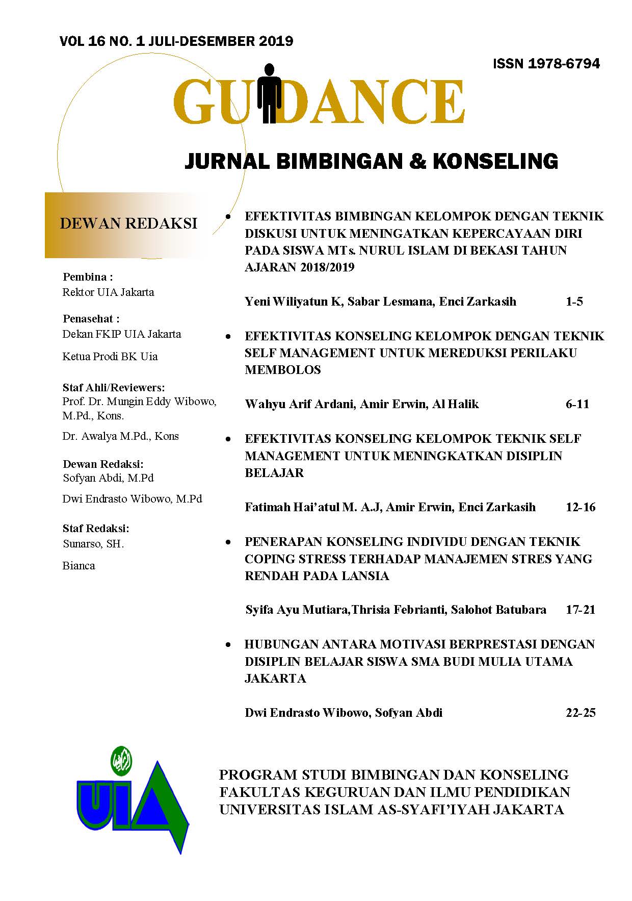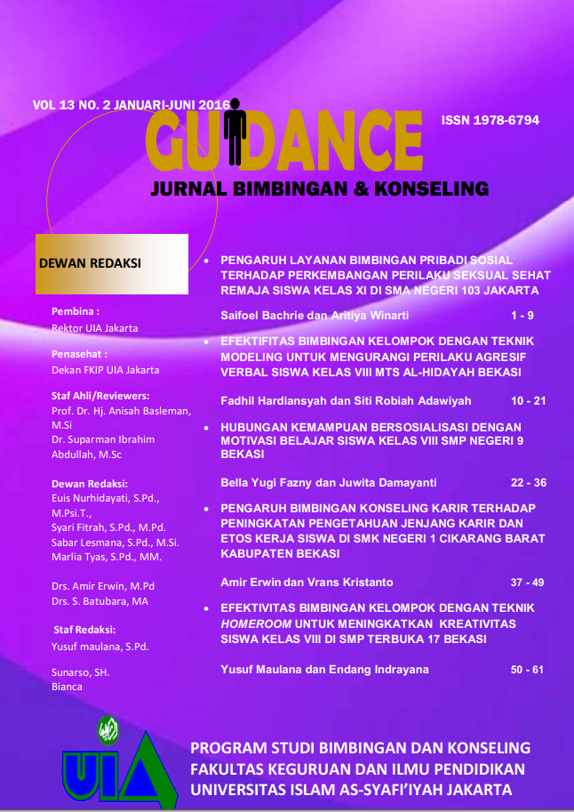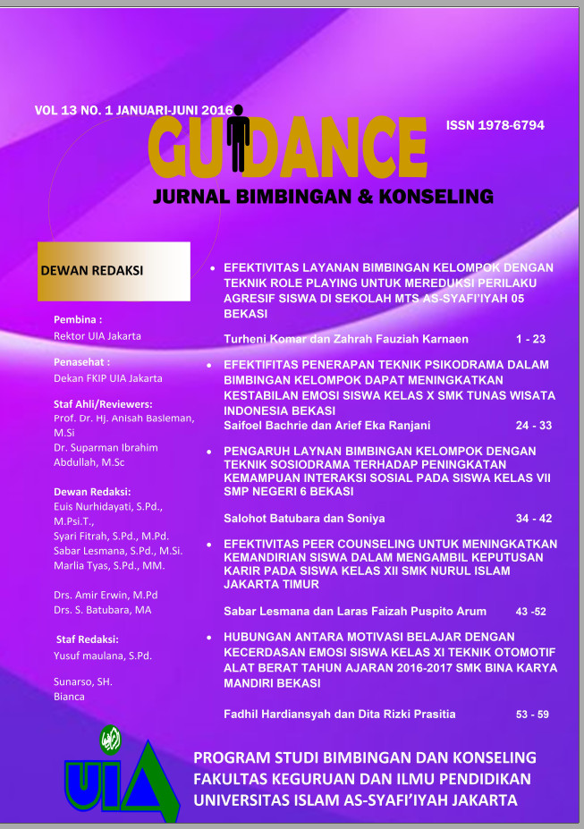 Vol. 16 No. 02 (2019)GUIDANCE merupakan Jurnal Bimbingan dan Konseling yang diterbitkan oleh Universitas Islam As-Syafi’iyah dalam dua kali setahun sebagai media publikasi ilmiah dalam kajian dan pengembangan Ilmu Bimbingan dan Konseling. Jurnal Guidance Vol. 16 No 02 2019 memuat artikel hasil penelitian yang relevan dalam bimbingan dan Konseling. -